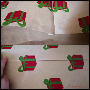 Alignment... 1. Put the item back on the paper until it's about centre. TRICK: Wrap the paper around until it overlaps then use your fingers to adjust the item until any straight edges of the paper line up (for me it was the side edges). This is important so that you can avoid accidental gaps and any folds/pleats you end up doing come out straight. Get creative: the overlap doesn't have to be in the middle! If you're wrapping a box, I sometimes put it along one side which gives it a bookish look. 2. Fold jagged edges in about 1cm - for ease, I only do it with the edge on the top layer of the overlap as it's the only edge that can be seen. If you have paper with a repeated pattern, you can try to align the fold to the pattern - this is very finicky to do on purpose so it's not a "must" but sometimes you just get lucky like I did with mine.